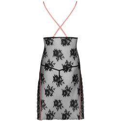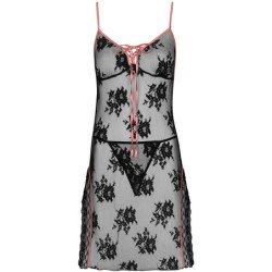 Karonin Dubarry Collection es un conjunto compuesto por un sensual camisón y tanga negro a juego. El conjunto está confeccionado en suave encaje calado y adornado además con una sutil cinta rosa empolvado atada al busto. Una combinación tan contrastante de rosa dulce y negro feroz hace que el atuendo agregue coraje y confianza en uno mismo. A su vez, el material del conjunto consigue que su usuaria se sienta lo mejor posible en su propio cuerpo. El encaje está confeccionado en poliamida agradable al tacto, que no raya y se adapta bien a la forma de la figura femenina.