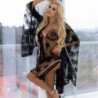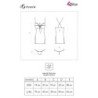 El modelo Karonin Dubarry Collection está compuesto por tangas sencillas y clásicas, visibles debajo de un camisón semitransparente con tirantes. El elemento exterior está elaborado con dos tipos de encaje: uno densamente decorado con remates y otro más transparente y revelador del cuerpo. Una ventaja adicional del conjunto, que enciende la imaginación y los sentidos, son las dos largas aberturas a los lados de la camisa, que dejan al descubierto la sensual línea de la cadera